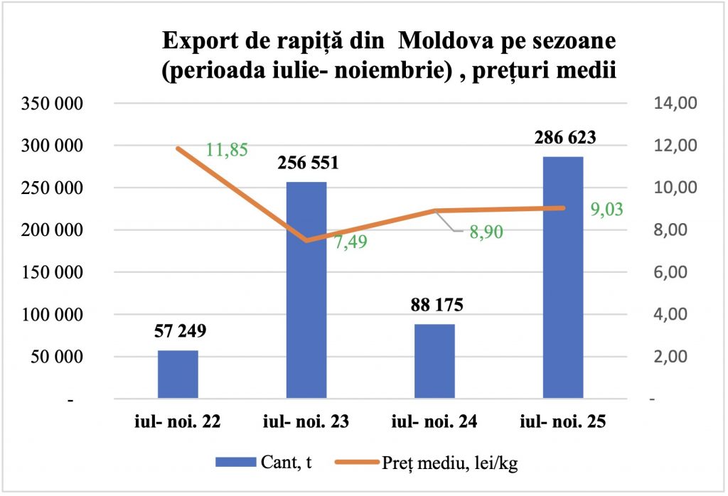 În ansamblu, analiza sezonului 2025–2026 indică faptul că, în perioada iulie–noiembrie, din Republica Moldova au fost livrate peste 325 000 de tone de rapiță, atât ca materie primă, cât și sub formă procesată.