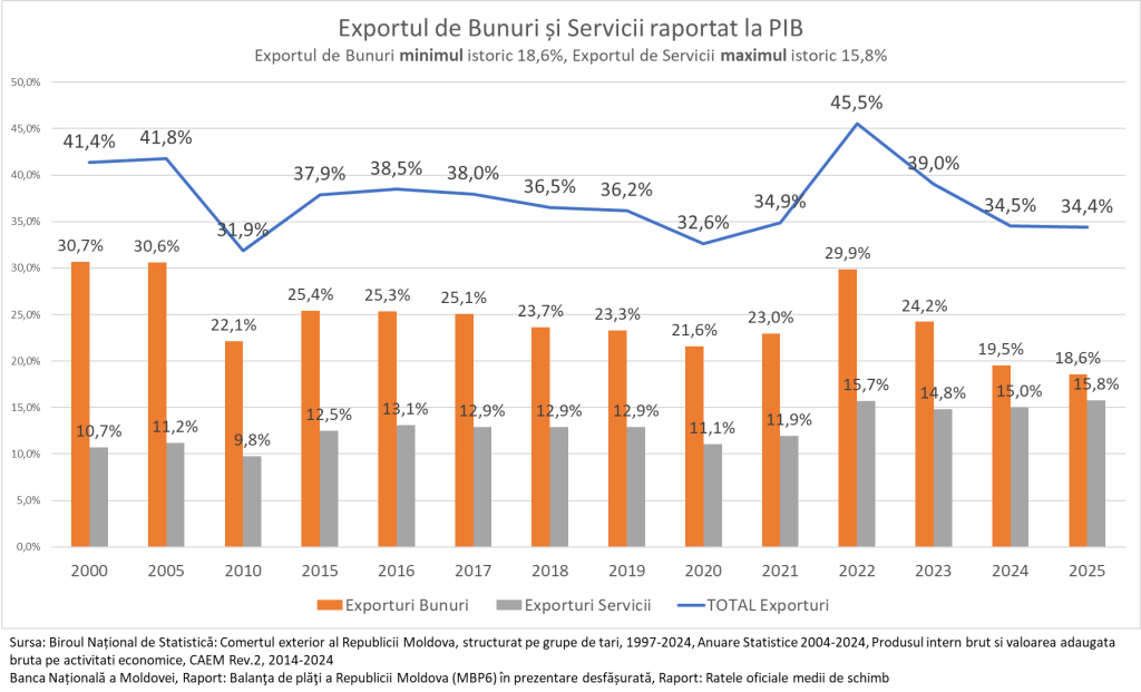 Această evoluție este determinată în primul rând de prăbușirea ponderii exporturilor de bunuri, care în 2025 au scăzut la un minim istoric de sub 19% din PIB.