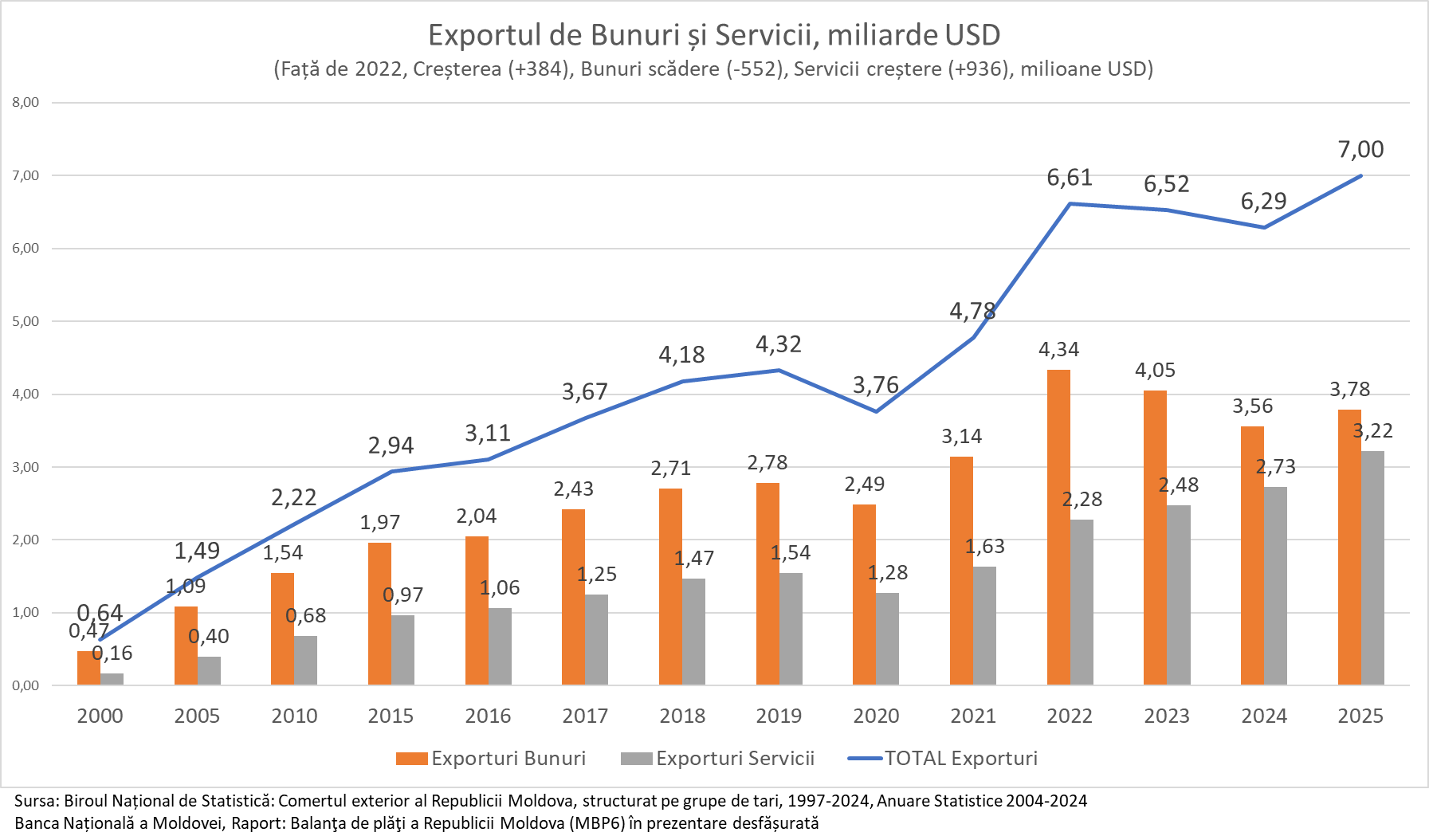 Astfel, se conturează două dinamici opuse: o diminuare constantă a exporturilor tradiționale și o consolidare rapidă a exporturilor de servicii.