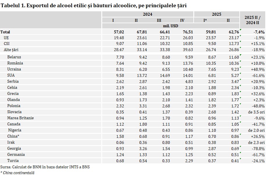 În primele șase luni ale acestui an, exporturile totale de alcool etilic și băuturi alcoolice din Republica Moldova – în special vinuri – au atins 122,57 milioane de dolari, înregistrând o scădere de circa 2% față de aceeași perioadă din 2024, potrivit datelor din balanța de plăți publicată de Banca Națională a Moldovei (BNM).