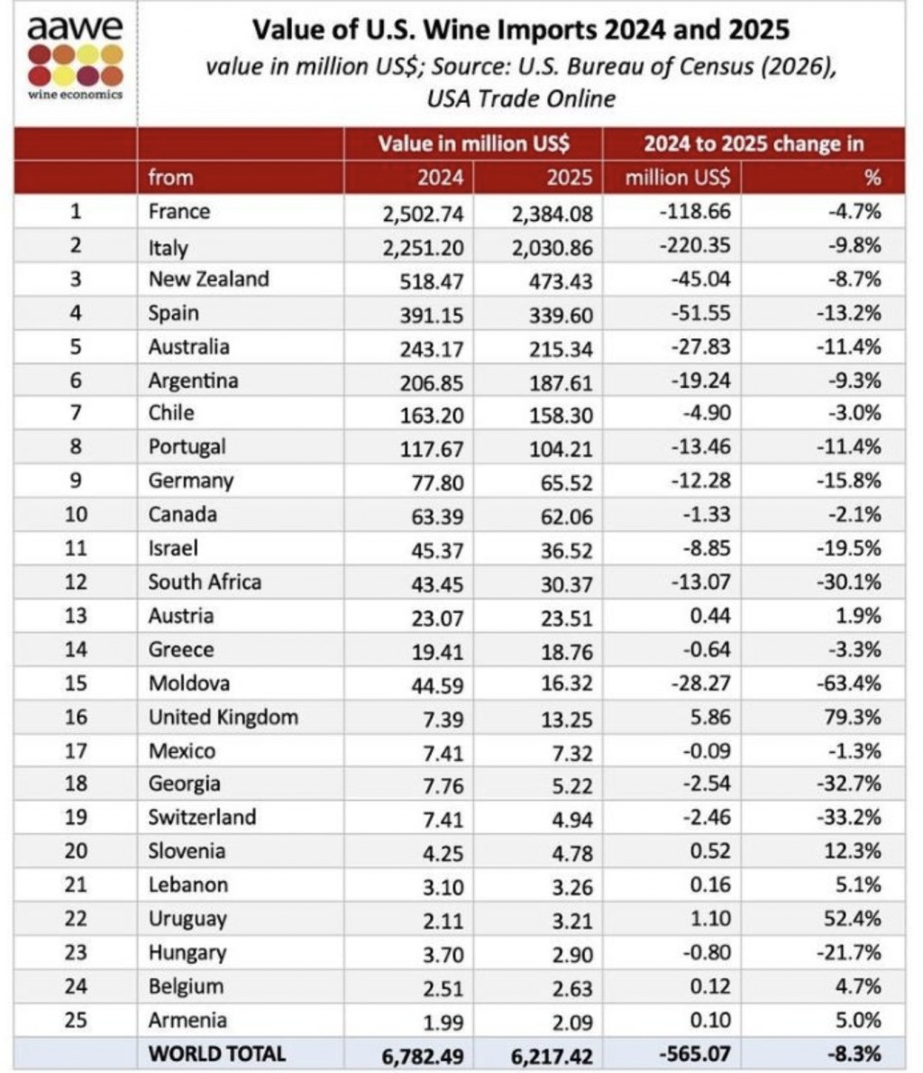 Vinurile din Italia (-220 de milioane de dolari) și Franța (-119 de milioane de dolari) au înregistrat cele mai mari pierderi absolute, adică reduceri ale importurilor ca valoare.