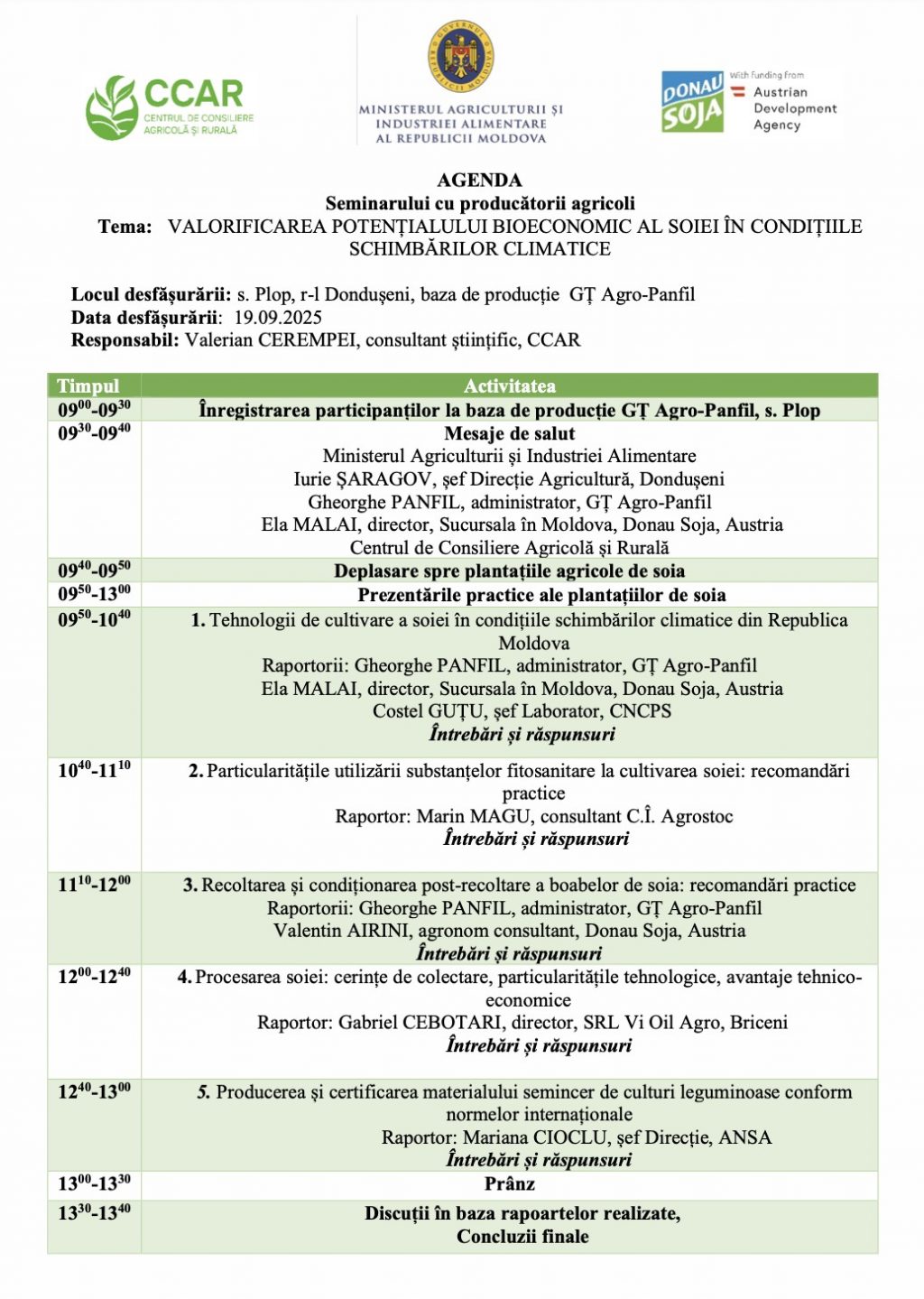 Pe 19 septembrie 2025, la baza de producție GȚ Agro-Panfil din s. Plop, r-n Dondușeni, va avea loc un seminar dedicat producătorilor agricoli, cu tema „Valorificarea potențialului bioeconomic al soiei în condițiile schimbărilor climatice”.