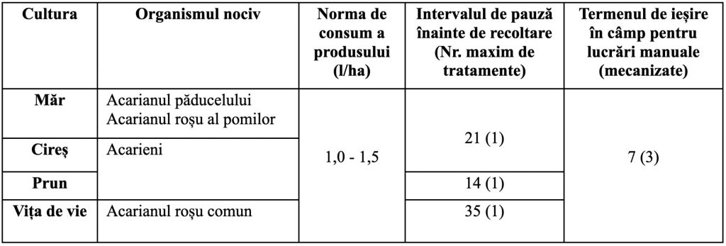 Produsul acționează prin inhibarea respirației mitocondriale, având efect de contact și ingestie. După tratament, acarienii își încetează rapid hrănirea, iar efectul se menține 21–28 de zile, în funcție de doză și cultură.