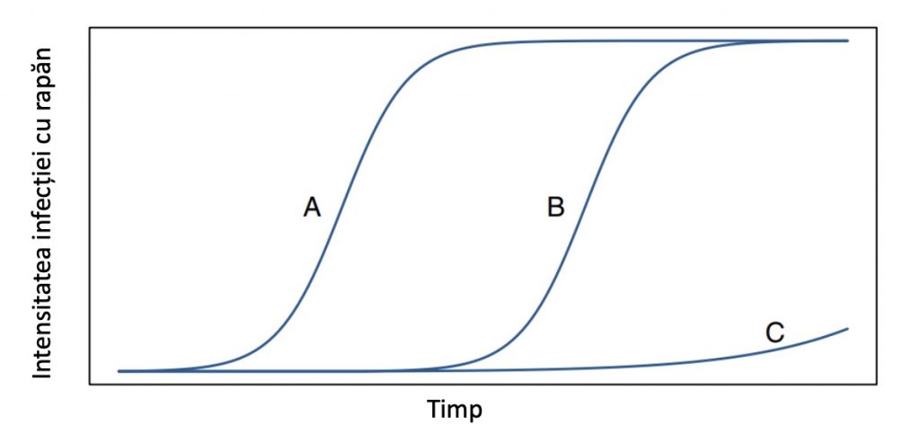 Imaginea 2. Dezvoltarea bolii la soiuri de plante cu gene diferite de rezistență: A) Un soi fără gene de rezistență; B) Un soi cu rezistență monogenică eficientă; C) Un soi cu rezistență poligenică. Sursă: Tronsmo A.M. et al. 2020. Plant Pathology and Plant Diseases. CAB International: