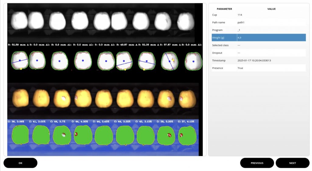 Echipamentele sunt dotate cu sisteme inteligente de recunoaștere vizuală, care analizează automat dimensiunea, forma, culoarea și calitatea externă a fiecărui produs, eliminând influența factorului uman.