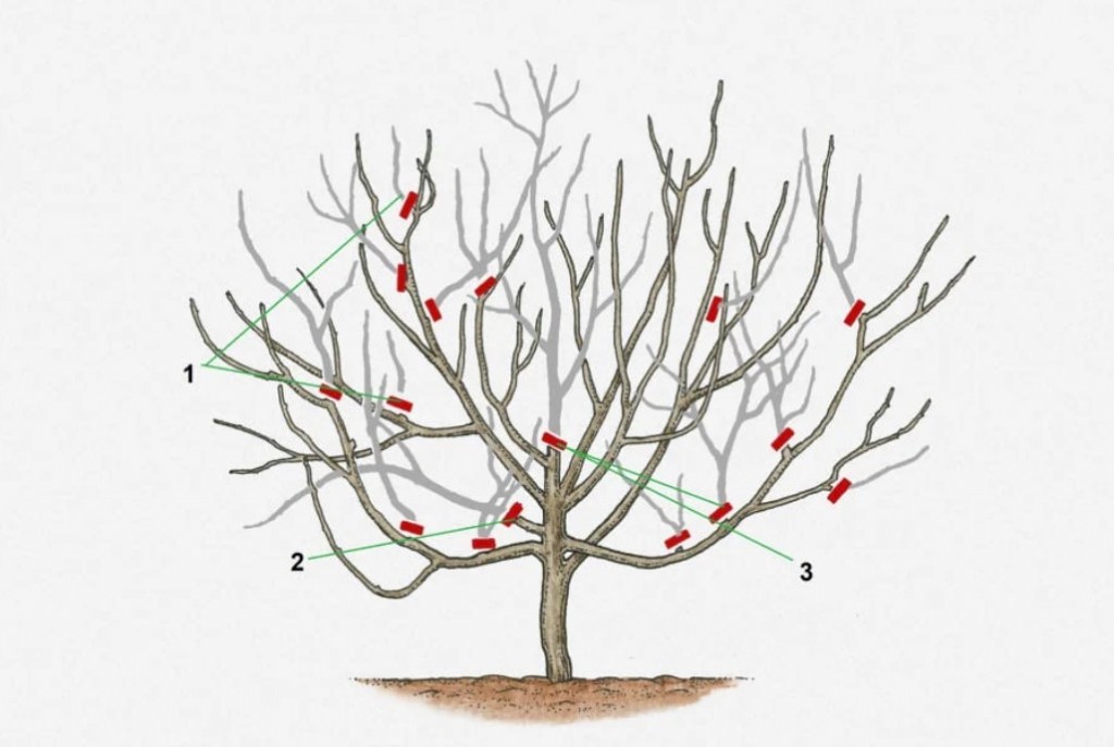 După un an, ramura principală se taie până la un mugur, iar în al treilea an, ramurile scheletice se reduc la jumătate din lungime. Această metodă permite formarea unei coroane corecte și echilibrate.