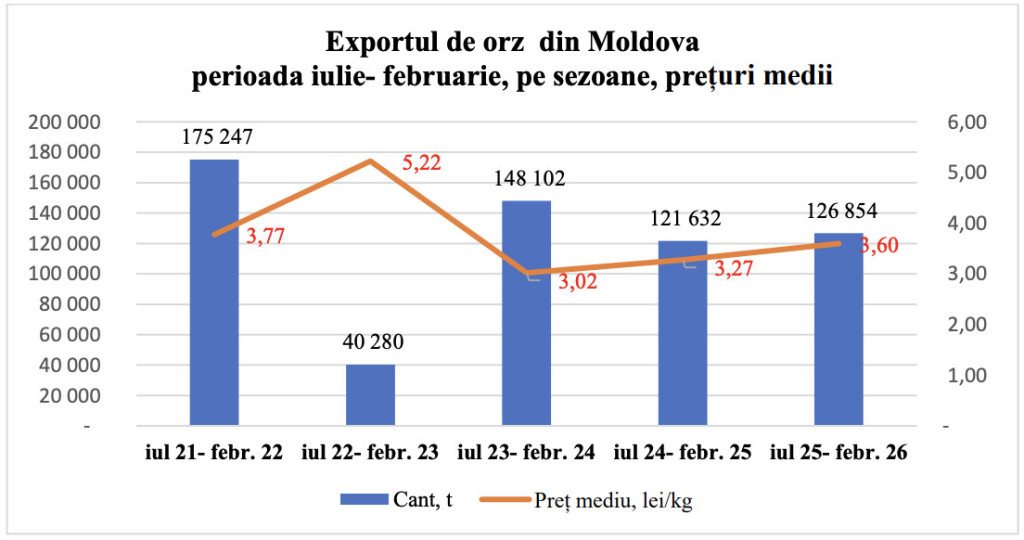 În sezonul 2025–2026, în perioada iulie–februarie, Republica Moldova a exportat 126 854 tone de orz, ceea ce reprezintă o creștere de 4,3% comparativ cu aceeași perioadă a sezonului precedent.