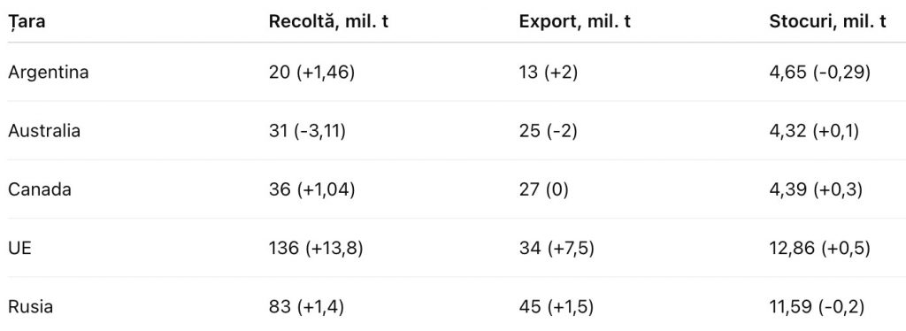 Prognoza privind exporturile globale de grâu este de 213 milioane tone (+6,87 milioane tone). Stocurile finale globale de grâu sunt estimate la 265,7 milioane tone (+0,52 milioane tone).