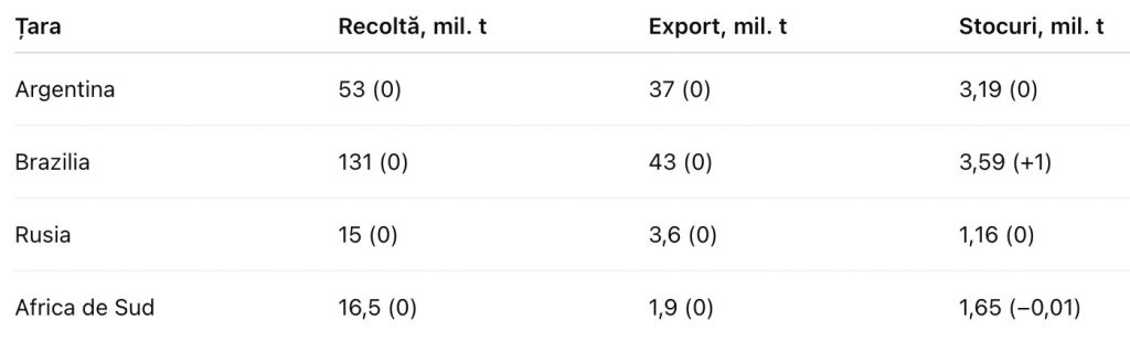 Pentru Ucraina, prognoza privind recolta de porumb este de 30,5 milioane tone, exporturile sunt estimate la 24 milioane tone, iar stocurile finale la 0,6 milioane tone.