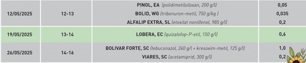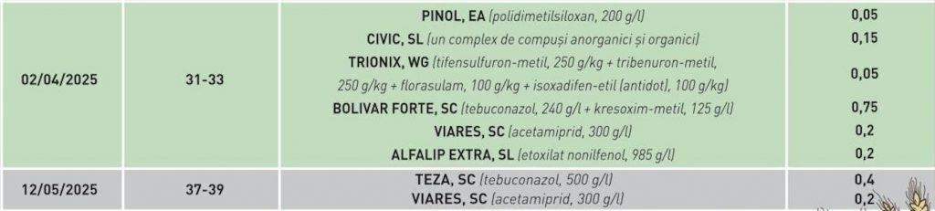 - Tratament semințe înainte de semănat: 02/10/2024 difenoconazol 90 g/l + tebuconazol 45 g/l + azoxistrobin 40 g/l 0,6 l/ha