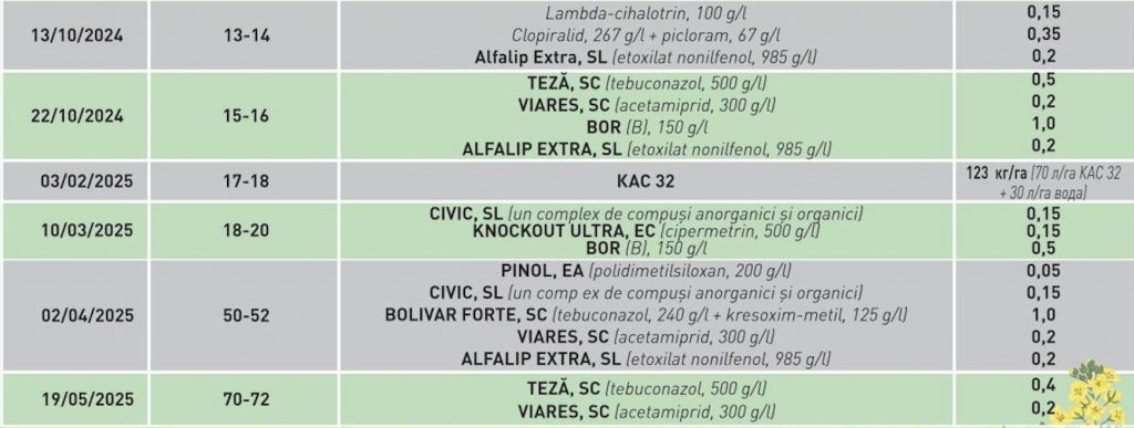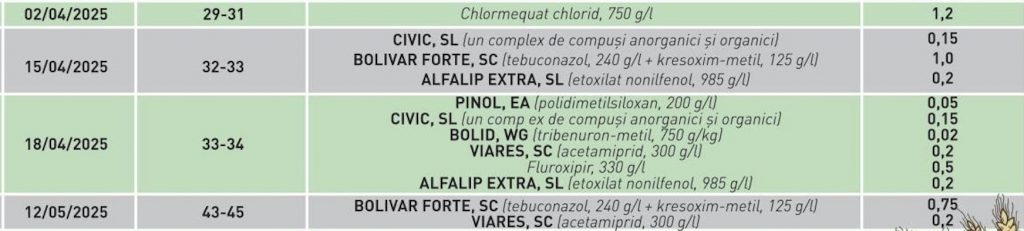 - Fertilizare foliară (primăvară): 03/02/2025 21–25 UAN 32 (îngrășământ lichid azotat) 123 kg/ha (70 l/ha UAN 32 + 30 l/ha apă).